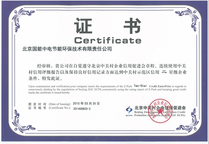 熱烈祝賀我公司榮獲“中關村示范區信用二星級企業證書”。國能中電已連續一年保持升級,證明國能中電在信用度方面贏得中關村管委會及中國人民銀行的認可,企業融資能力不斷攀升,我公司可享受比例為25%的企業貸款貼息。